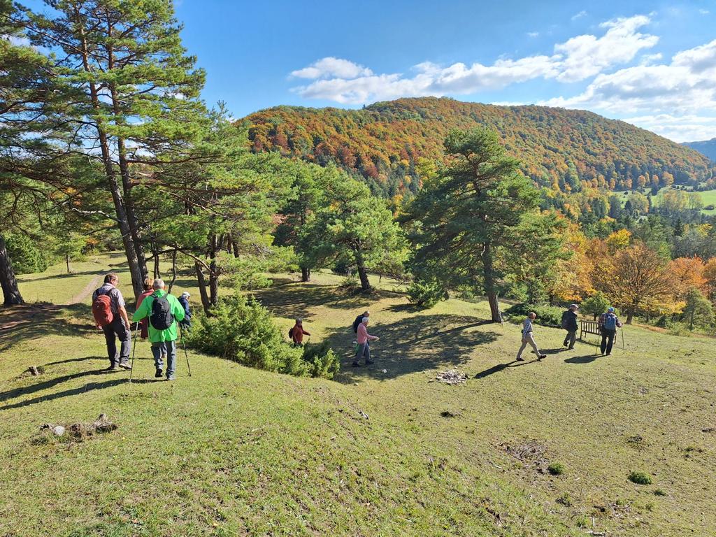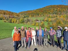 Bei goldenem Oktoberwetter trafen sich 14 Wanderer am Schwarzhornparkplatz zur Wanderung um den Heldenberg. Zunächst gings hoch zum Tanzbödele, hier trafen sich früher im Frühjahr Jugendliche zu einem Tanz um den Baum. Das Tanzbödele war dann früher auch der Festplatz für das Pfingstfest, das dann aus Gründen des Natur- und Landschaftschutzes auf den heutigen Festplatz am Schwarzhornparkplatz verlegt wurde.
